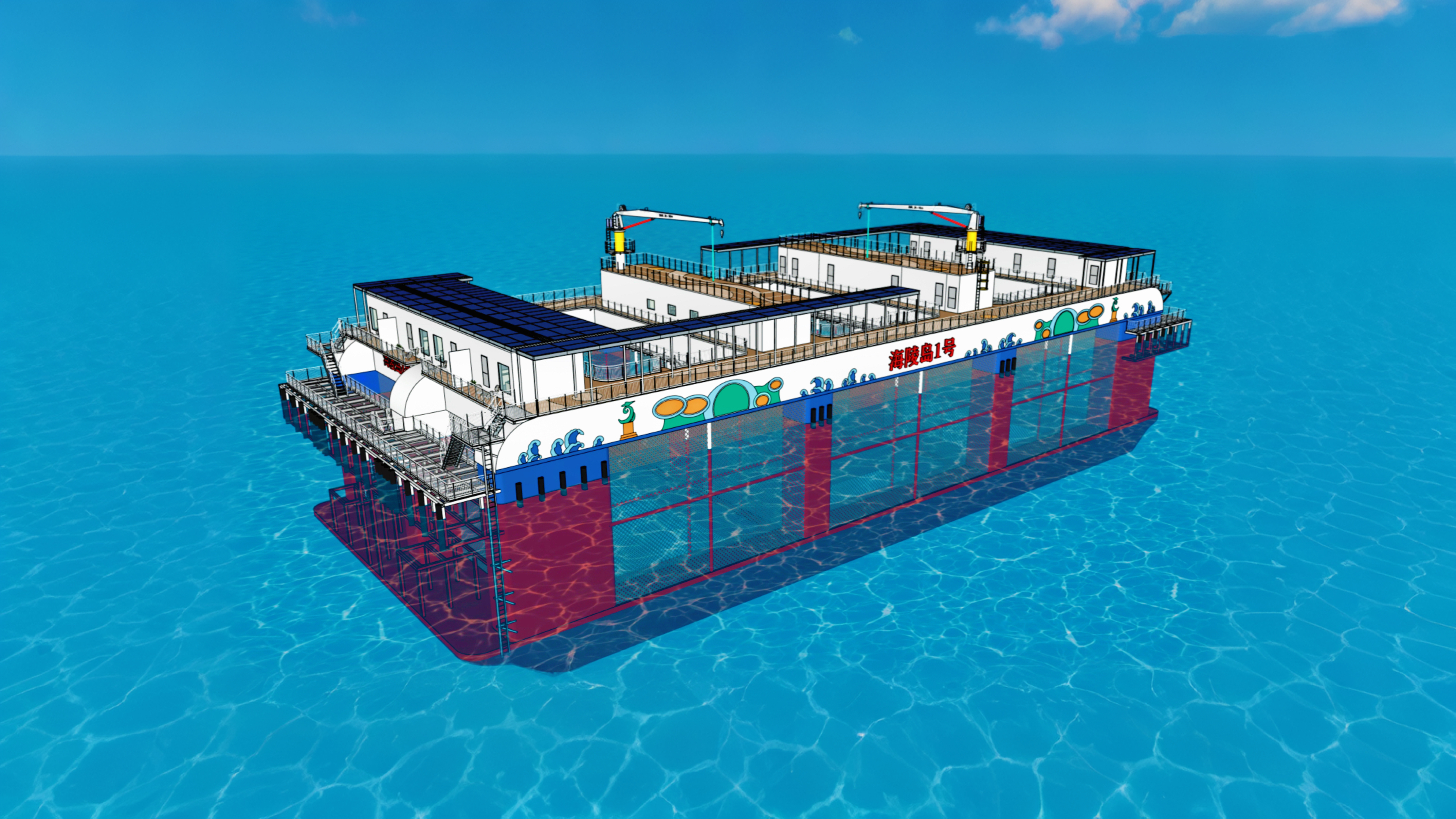 “海陵島一號(hào)”生態(tài)化海洋牧場(chǎng)創(chuàng)新園是大型半潛式桁架養(yǎng)殖平臺(tái),全長(zhǎng)82米,型寬36米,型深15米,平臺(tái)高度21.5米,總養(yǎng)殖水體達(dá)4.4萬(wàn)立方米,入級(jí)中國(guó)船級(jí)社。該平臺(tái)集成了智能投喂、環(huán)境監(jiān)測(cè)、病害預(yù)警等先進(jìn)系統(tǒng),可實(shí)現(xiàn)漁業(yè)養(yǎng)殖集約化、智能化、綠色化發(fā)展。
